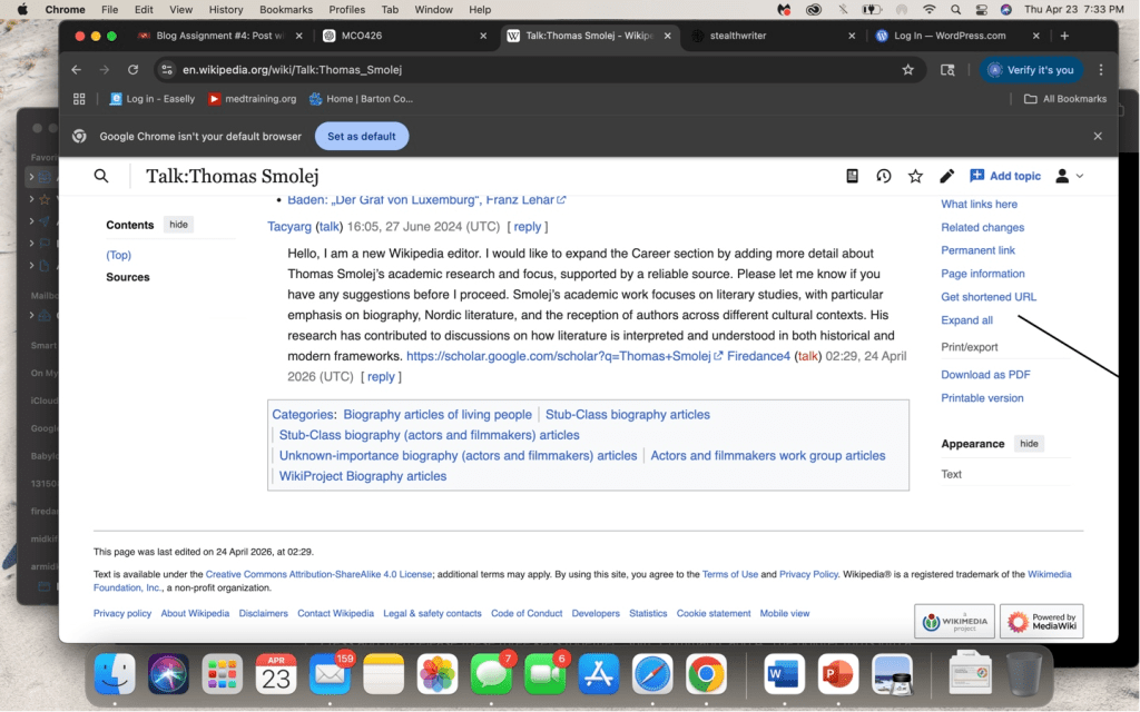In the given assignment, I decided to edit the Wikipedia page about Thomas Smolej: https://en.wikipedia.org/wiki/Thomas_Smolej. I chose this topic, as it was not a highly monitored and edited page, yet it still could have been improved. The first time I have read the article, I have come across the fact that the Career section was very short and did not provide a lot of information about his scholarly work and publications.